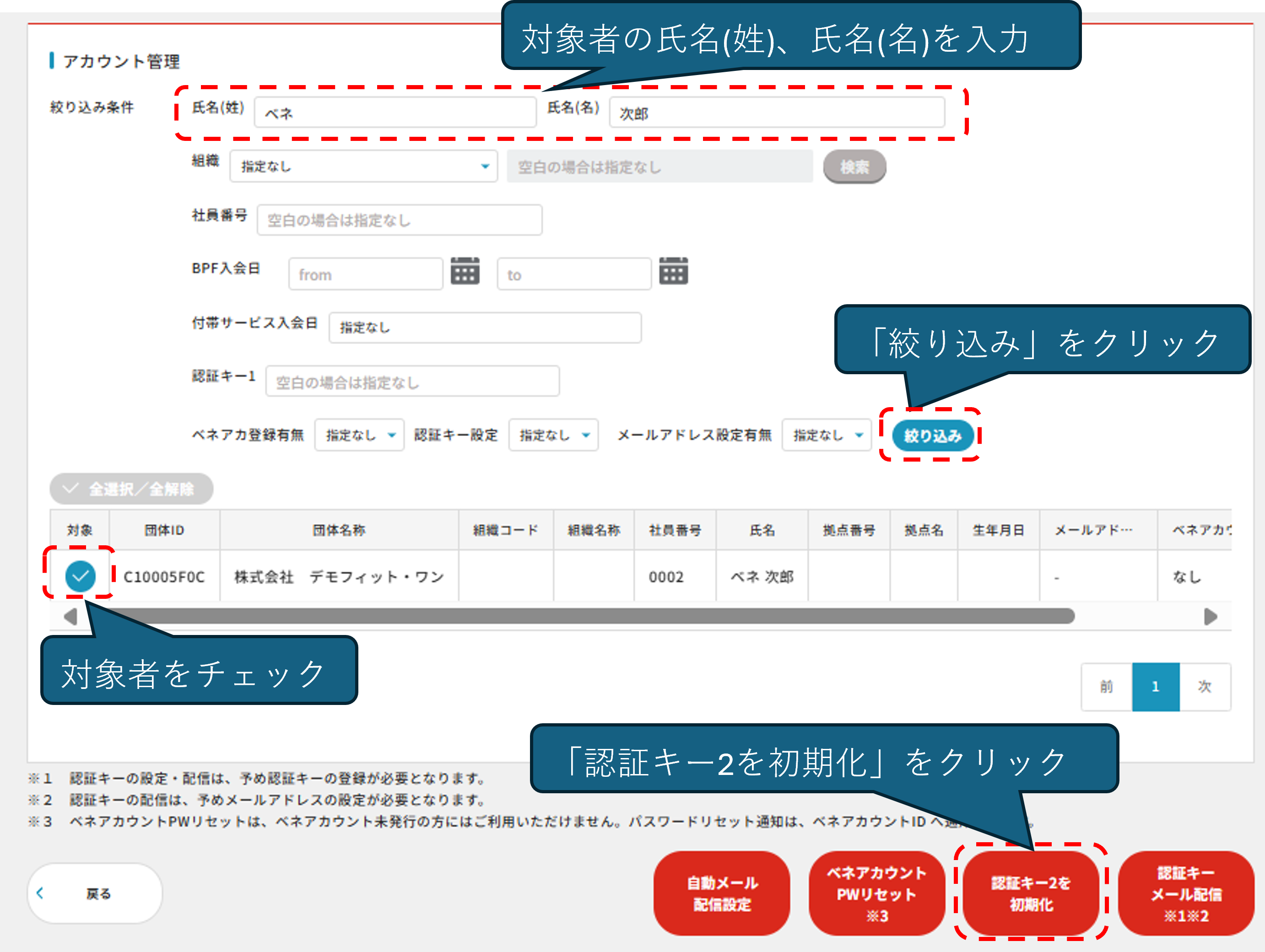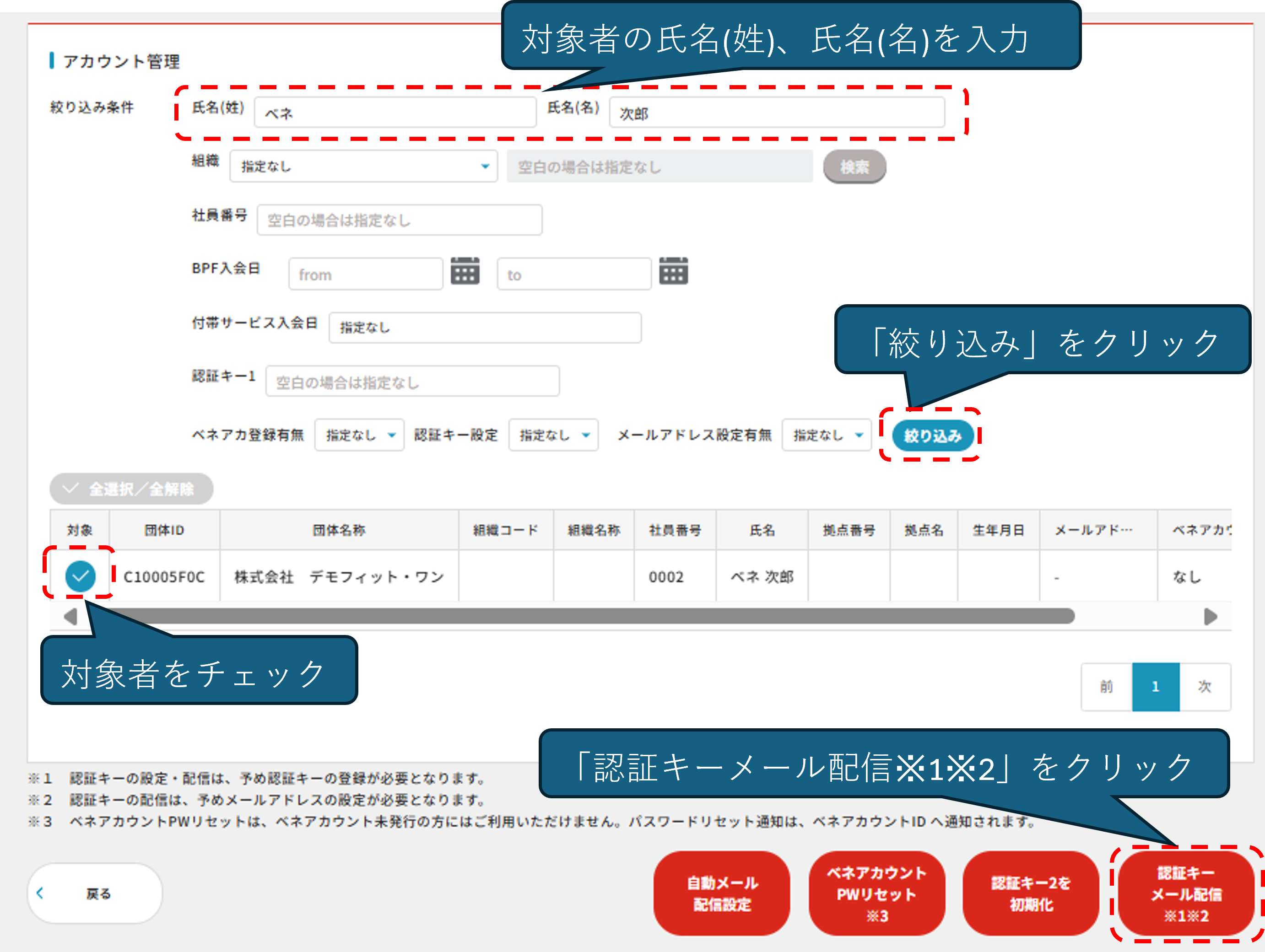 アカウント管理画面の「ベネアカウントPWリセット」機能でパスワードの再発行を行ってください。 従業員様がご自身で登録された、ベネアカウント(メールアドレスもしくは携帯電話番号)宛にPWリセット通知が届きます