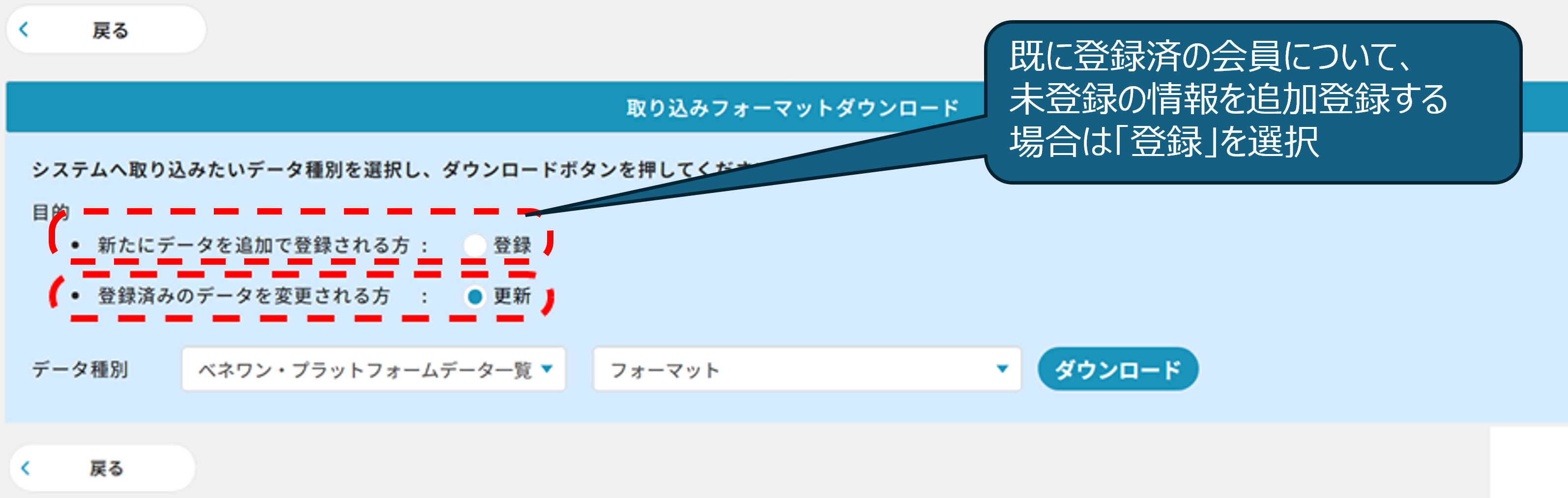 登録、修正する内容項目によってダウンロードするフォーマットが以下のように異なります。