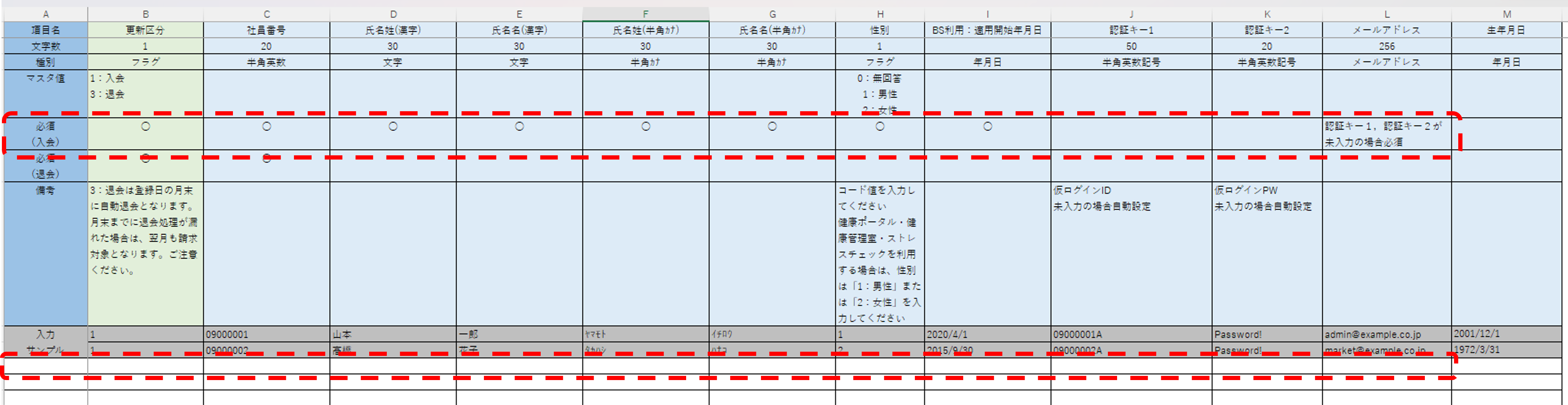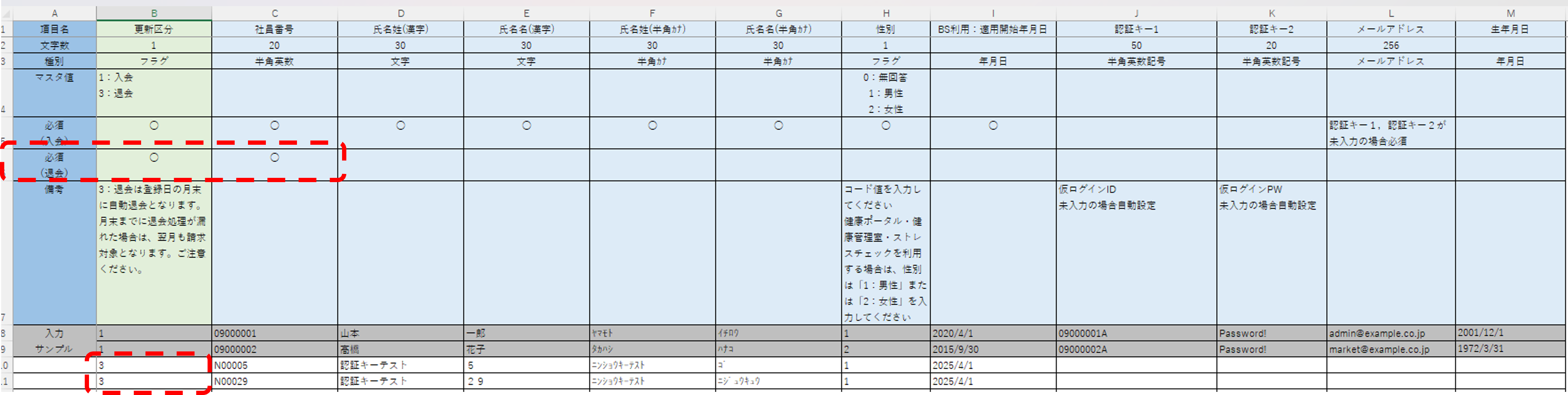 | 更新区分 | 退会登録者は更新区分の列に「3」を入力します |