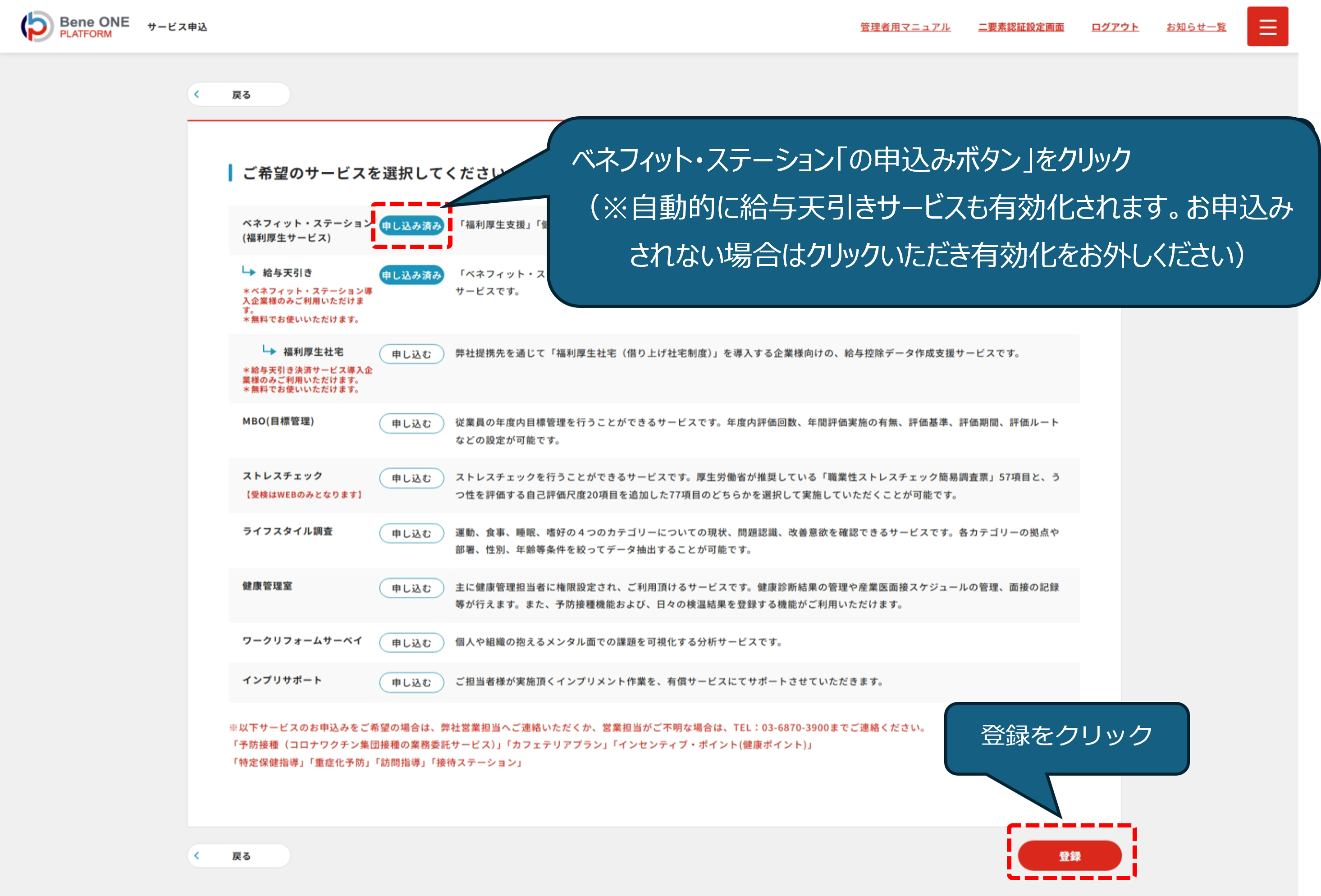ベネフィット・ステーションのサービス申込み、基本社員情報の登録、各種必要情報登録、対象社員情報の登録、