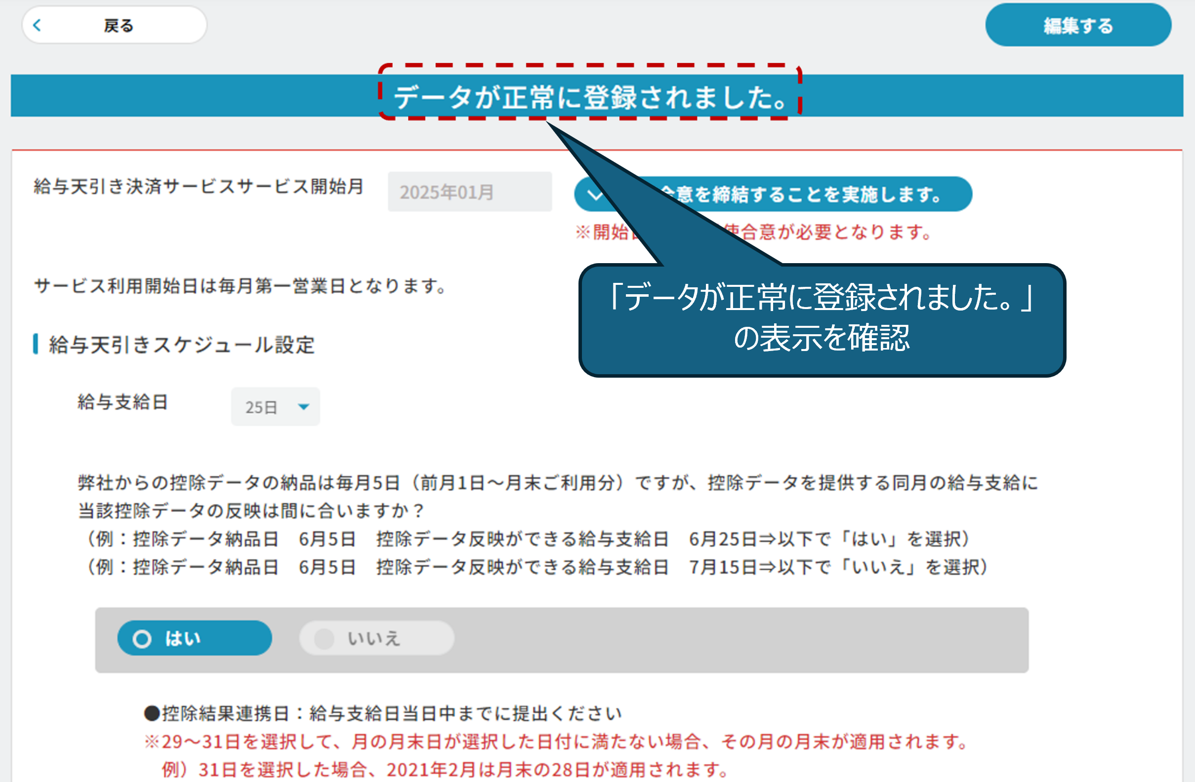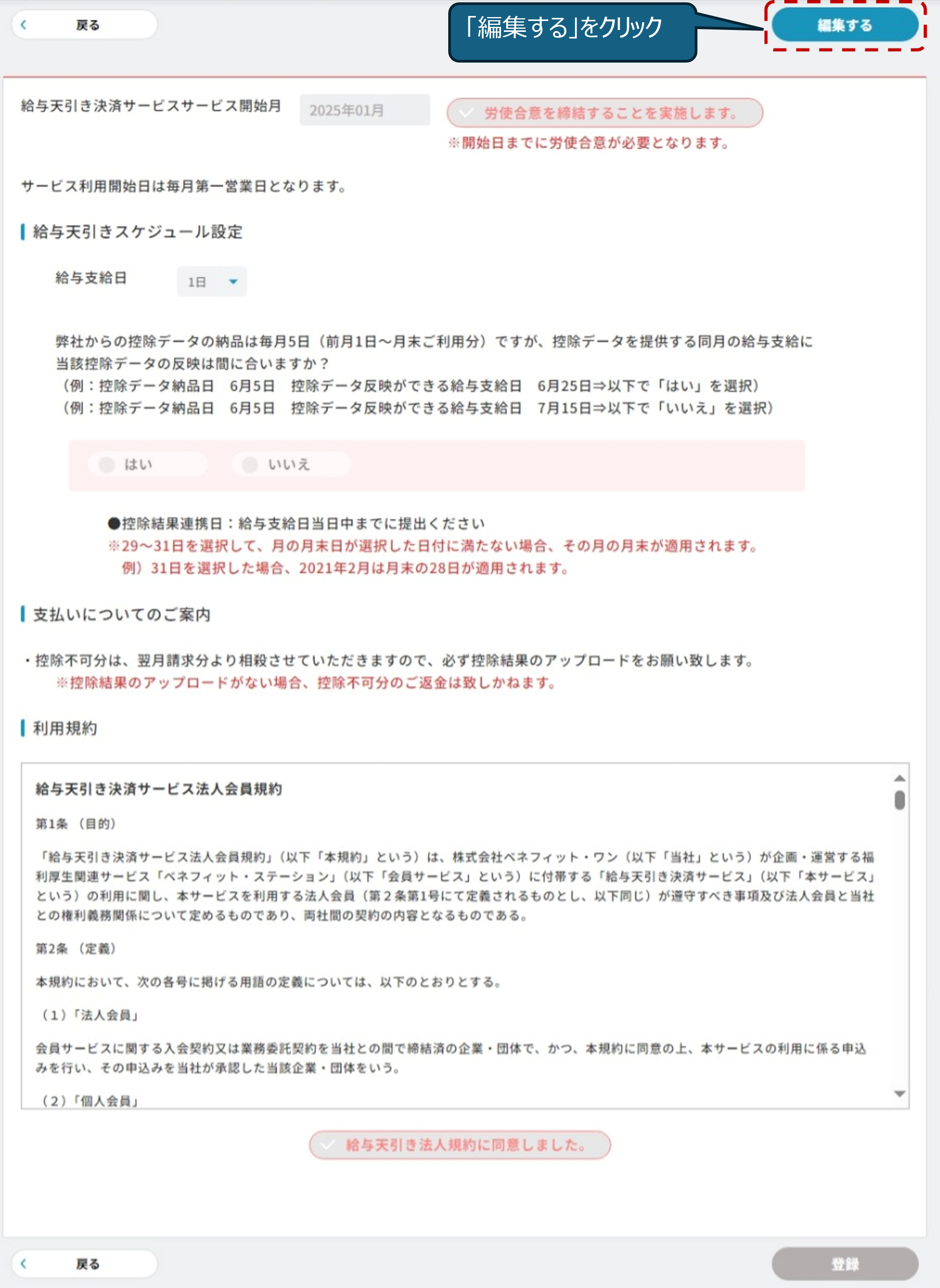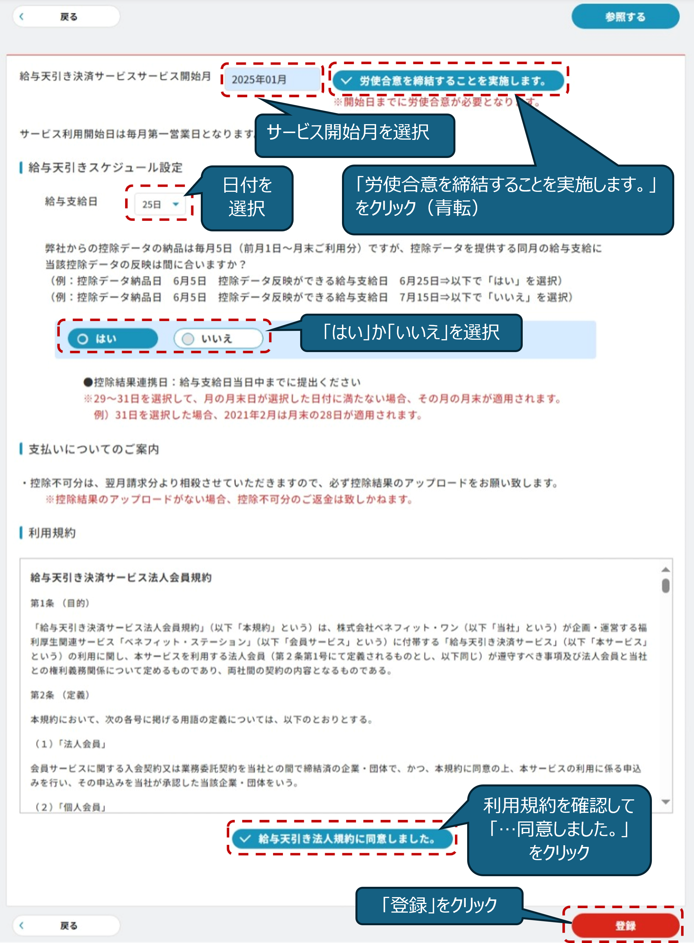 給トク払いサービスの開始日設定や利用規約への同意等を行っていただきます。