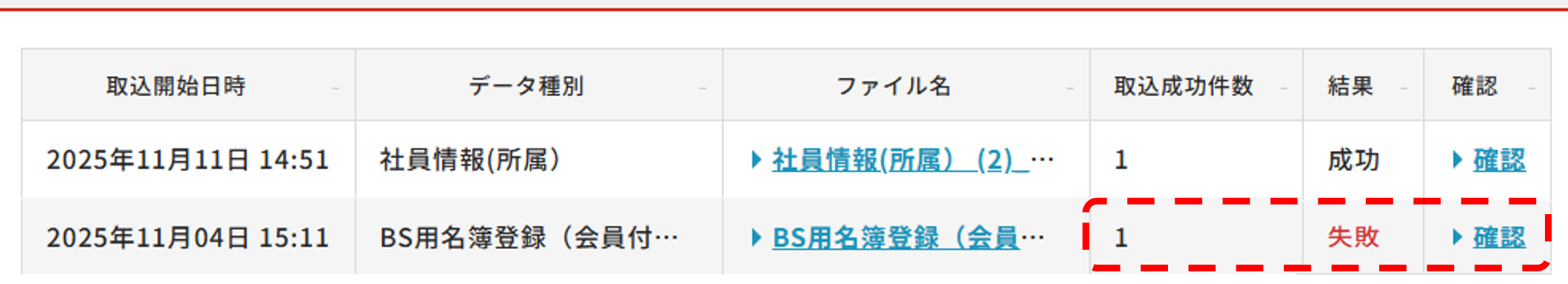 ・取込成功件数欄に「ー」が表示され、結果欄に「失敗」と記載がある場合は取込は失敗しています