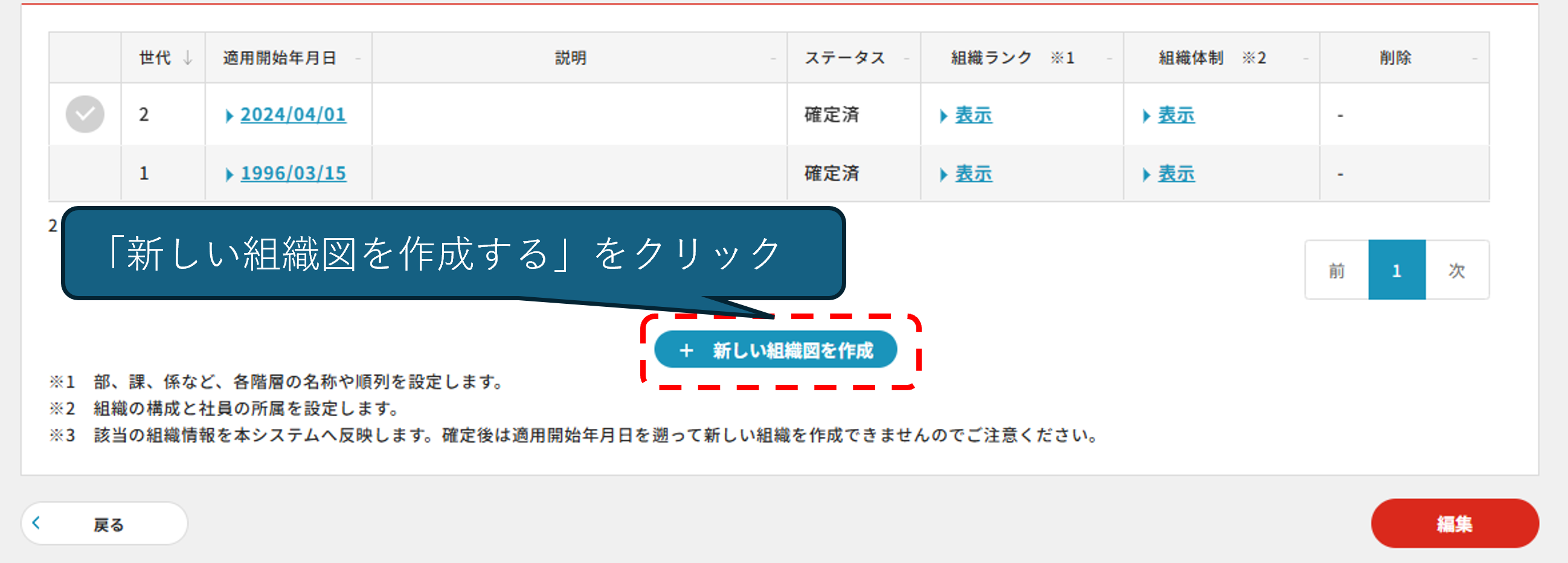 組織一覧のなかから設定開始した世代(例では世代5)の「組織体制」、「編集」を押下します