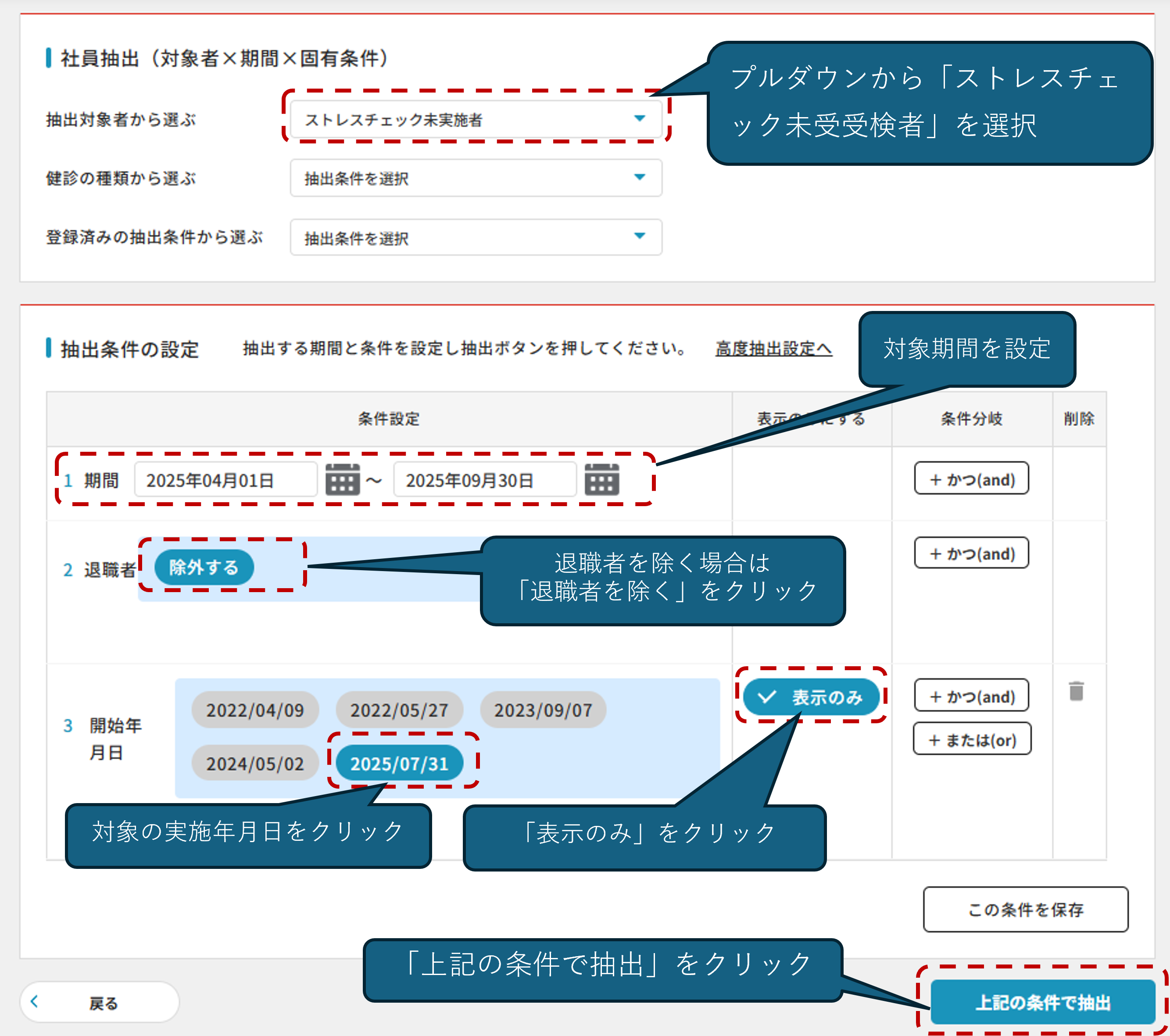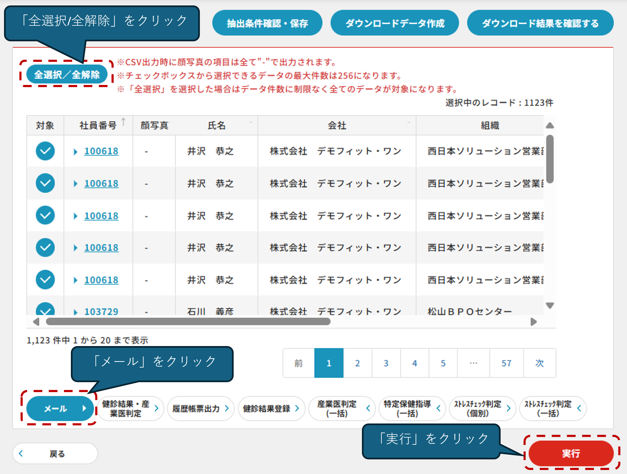 ④ 各従業員様の素点、判定結果を確認、勧奨メールを送信する