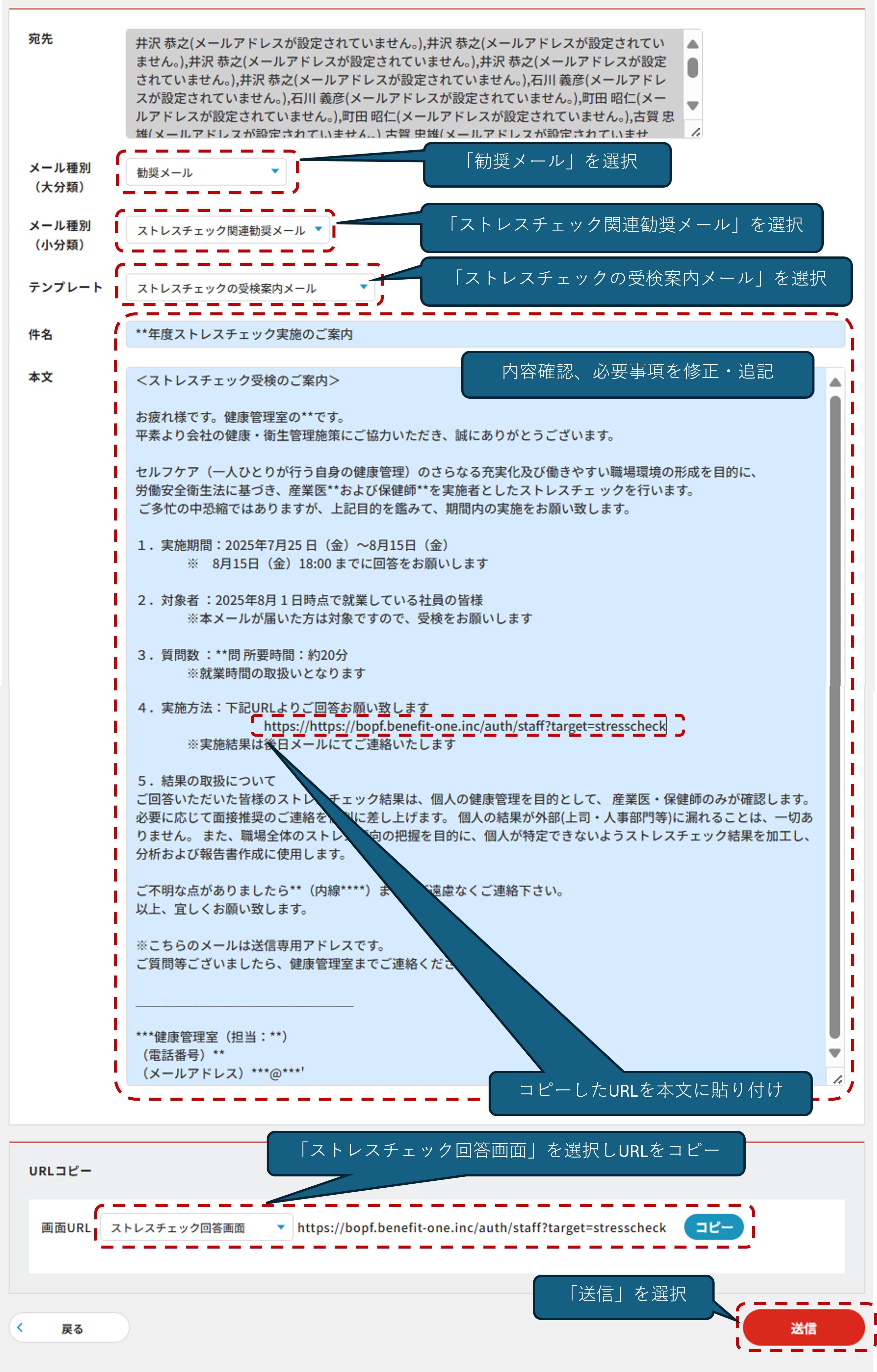 ストレスチェックの設定が完了したら受検対象の従業員に受検勧奨メールを送信します。